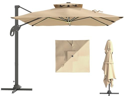Outsunny 2.5m Cantilever Parasol with Solar Powered LED Lights, Double Top Square Overhanging Garden Parasol with 360° Rotation, Tilt Adjustment, Crank Handle, Khaki