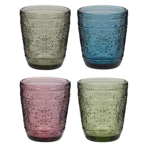 Ulable Set of 4-360ml/12oz Vintage Tumbler Glasses - Decorative Floral Embossed Water Glasses - Heavy Duty Glassware Beverages Tumblers for Whisky, Beer, Juice, Wine, Green & Blue & Pink & Grey