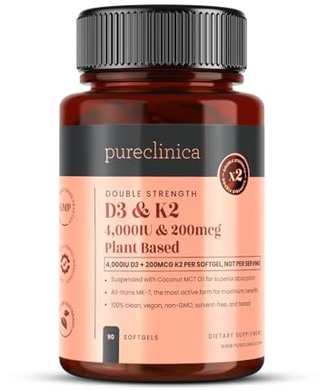 Double Strength Vitamin D3 + K2 (MK-7) – 4,000 IU D3 + 100mcg K2 x 180 Vegan Softgels (2 Bottles of 90) – Plant-Based Lichen D3 & Natto MK-7 – Enhanced Absorption with MCT Oil - 6 Months Supply