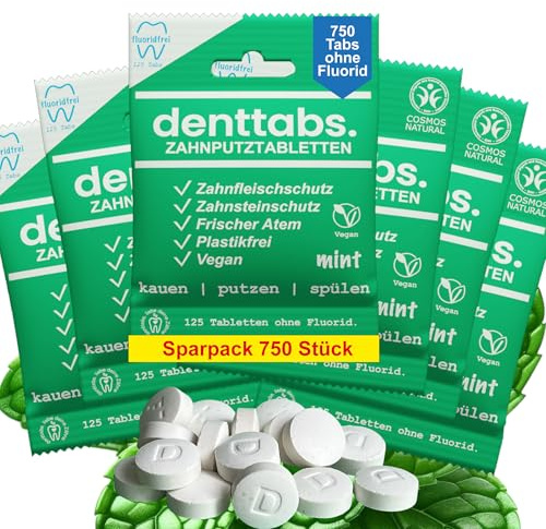 Denttabs Toothbrush Tablets XXXL Annual Supply 750 Pieces in a Deposit Bottle. Mint with Fluoride. Caries Protection without Preservatives. The Complete Alternative to Conventional Toothpaste
